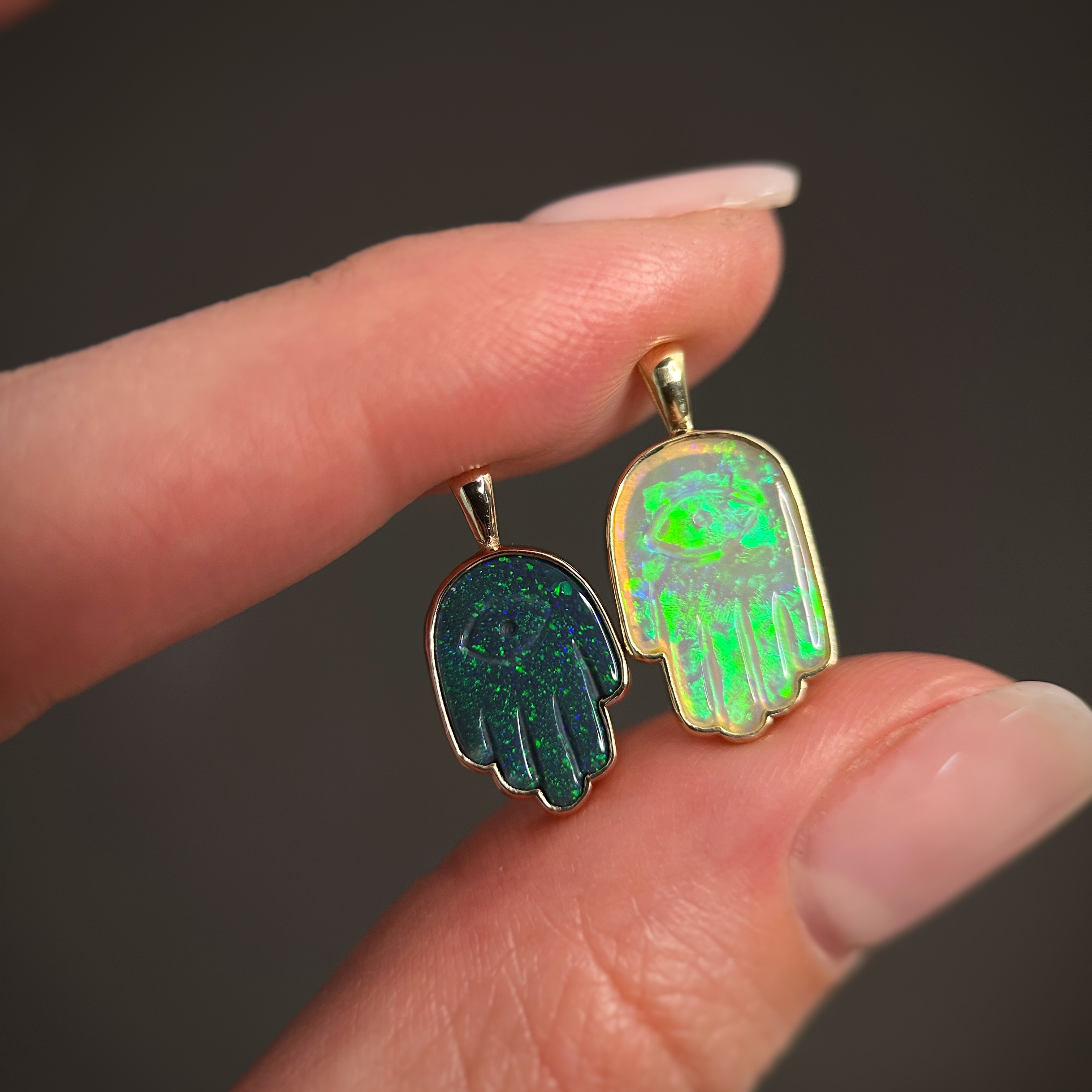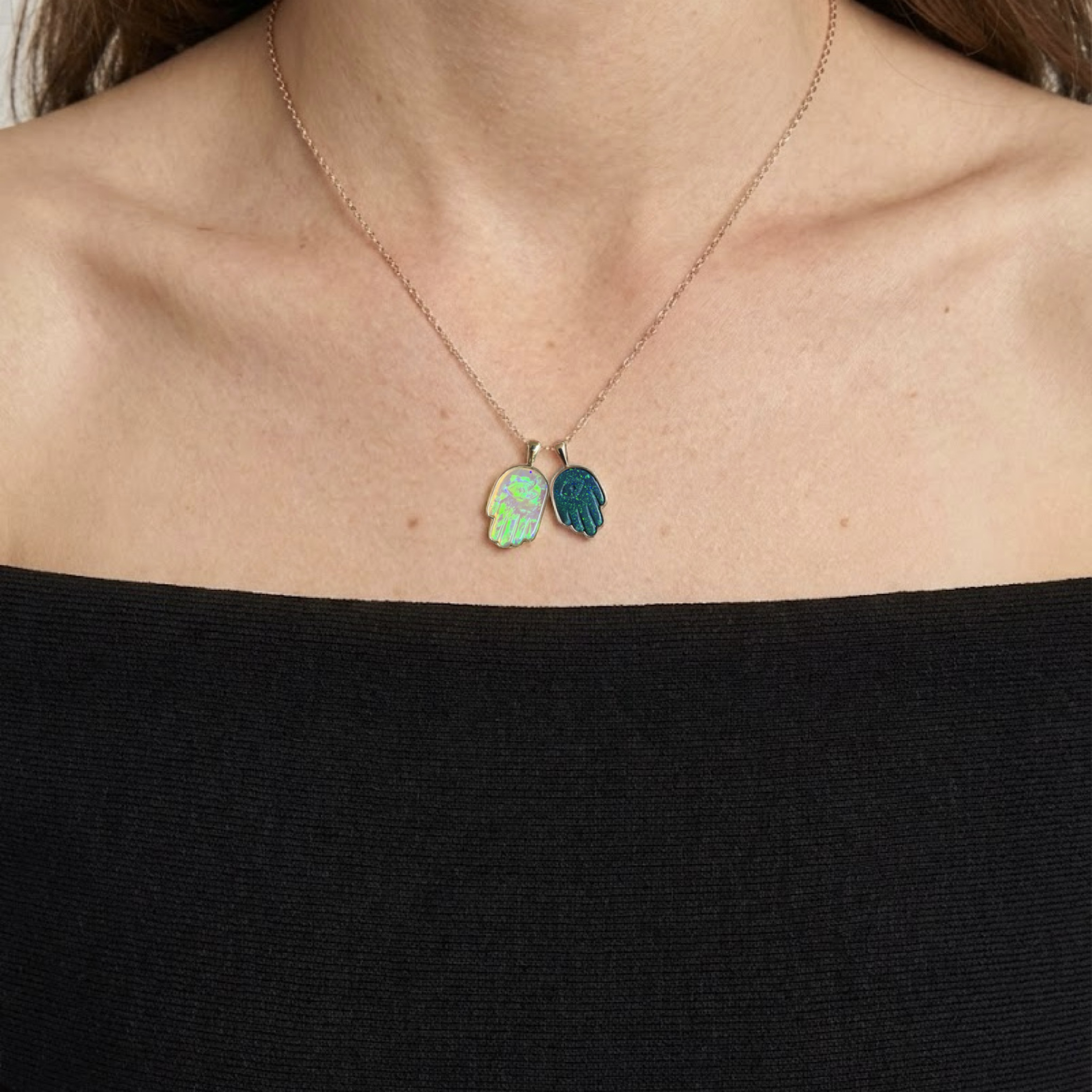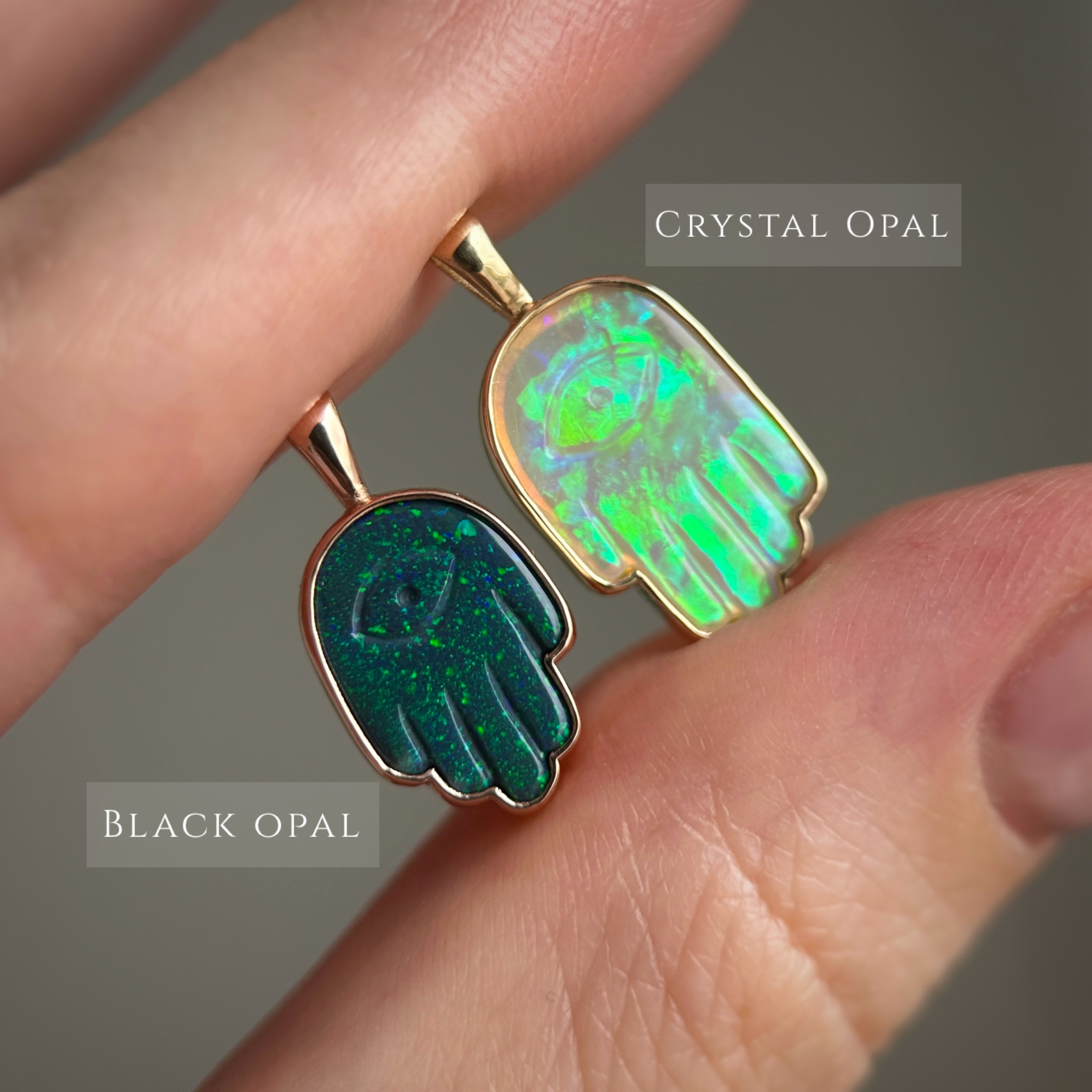 - Opal size: Black opal 12.5×8.5mm (1.45 ct), Crystal opal 14.3×9.2mm (1.6 ct)
