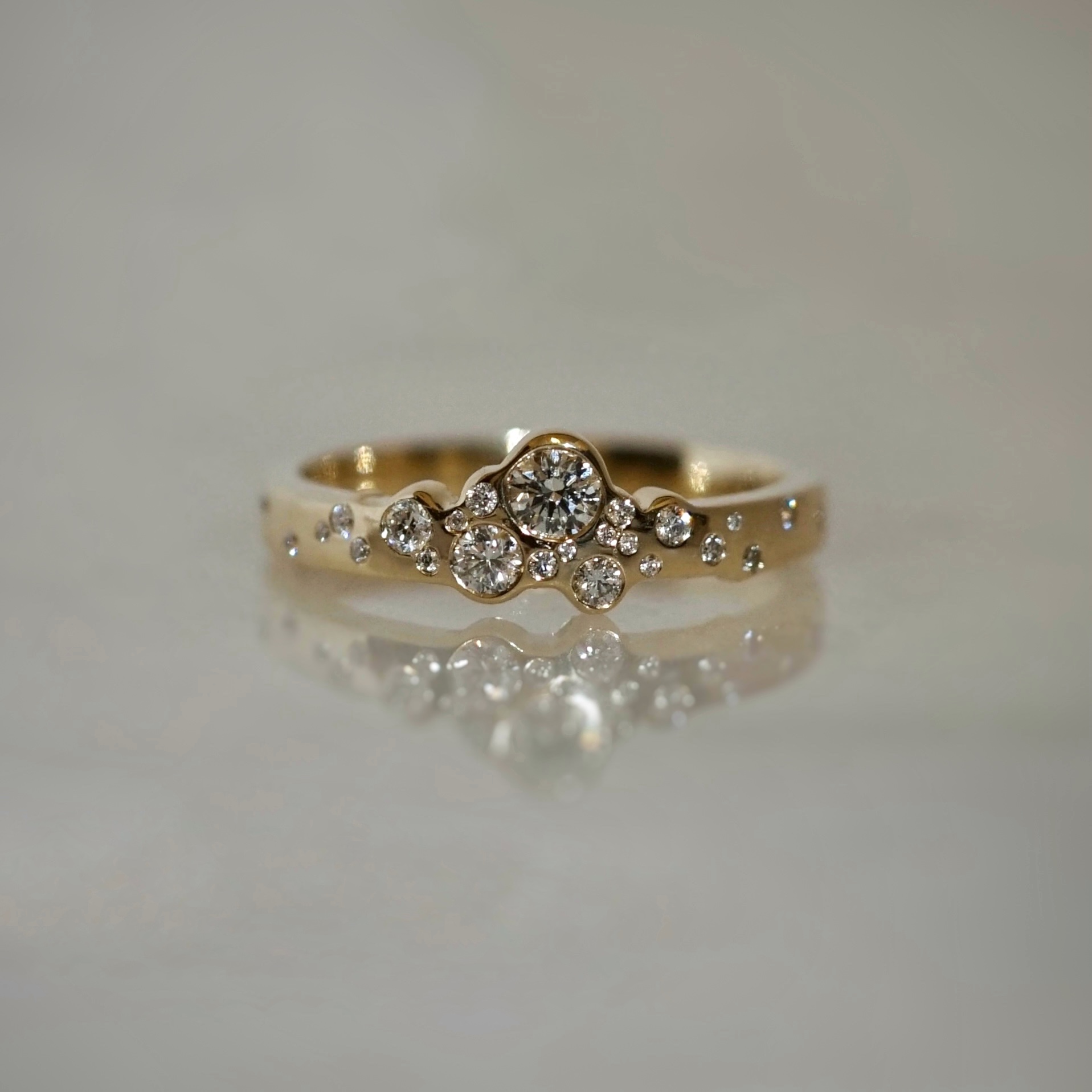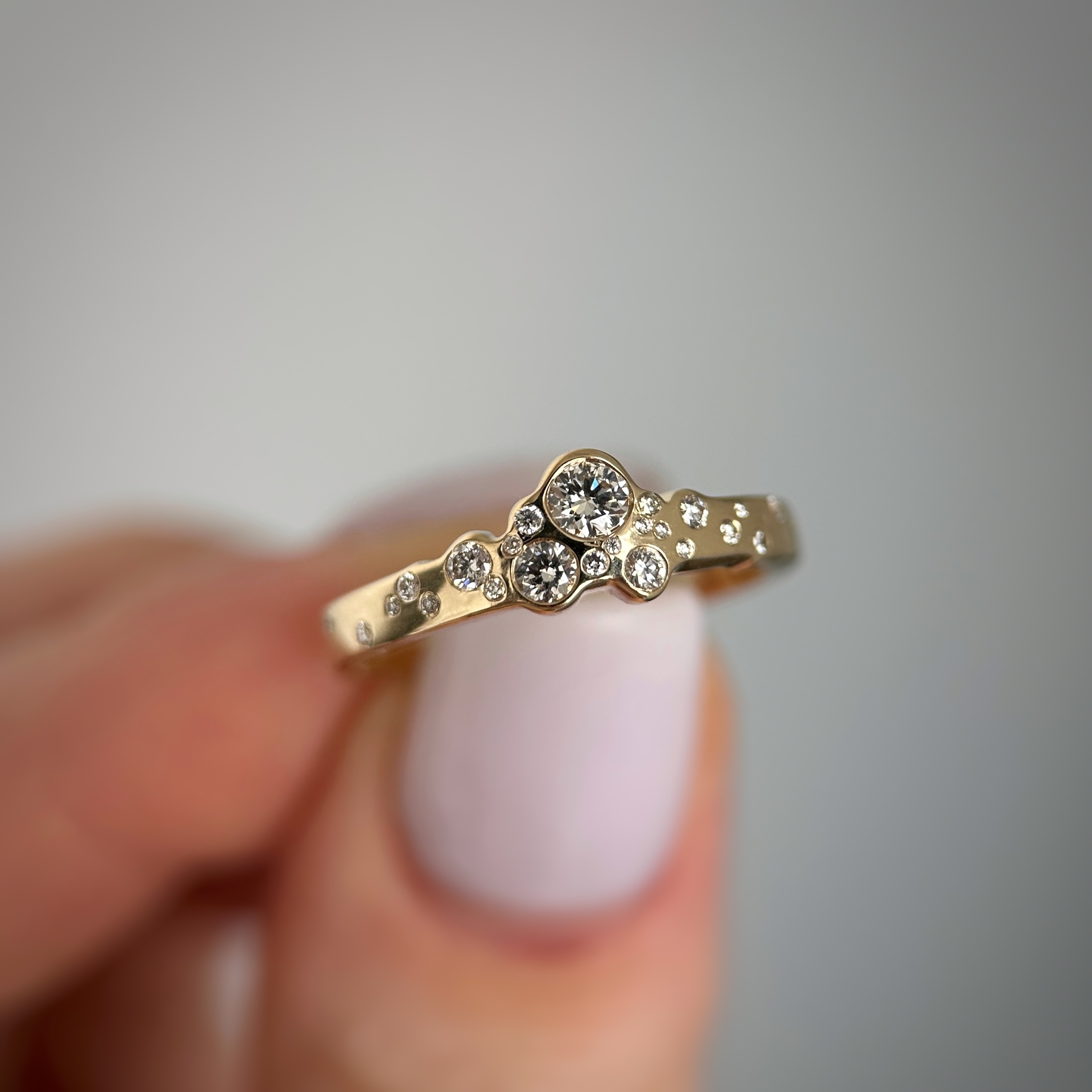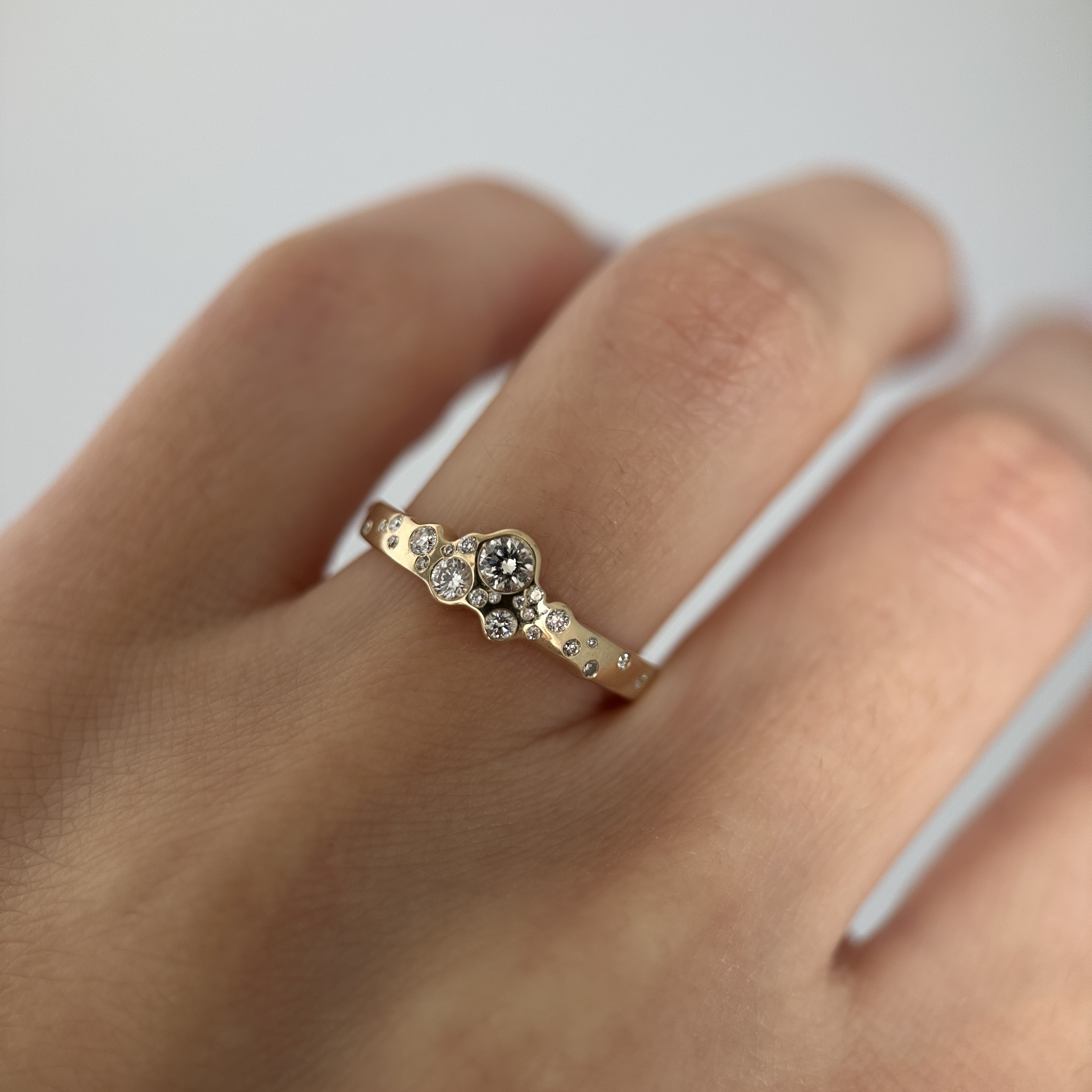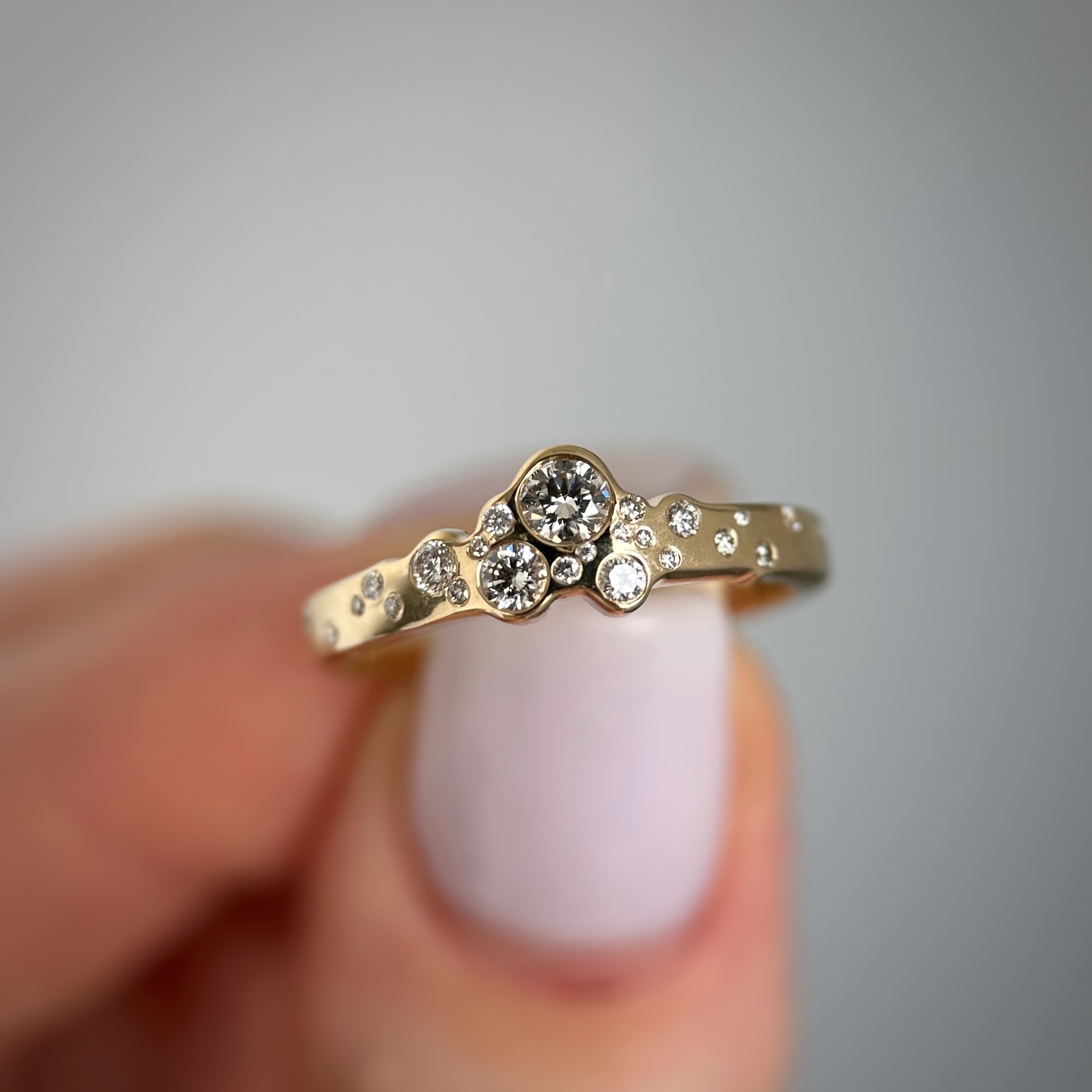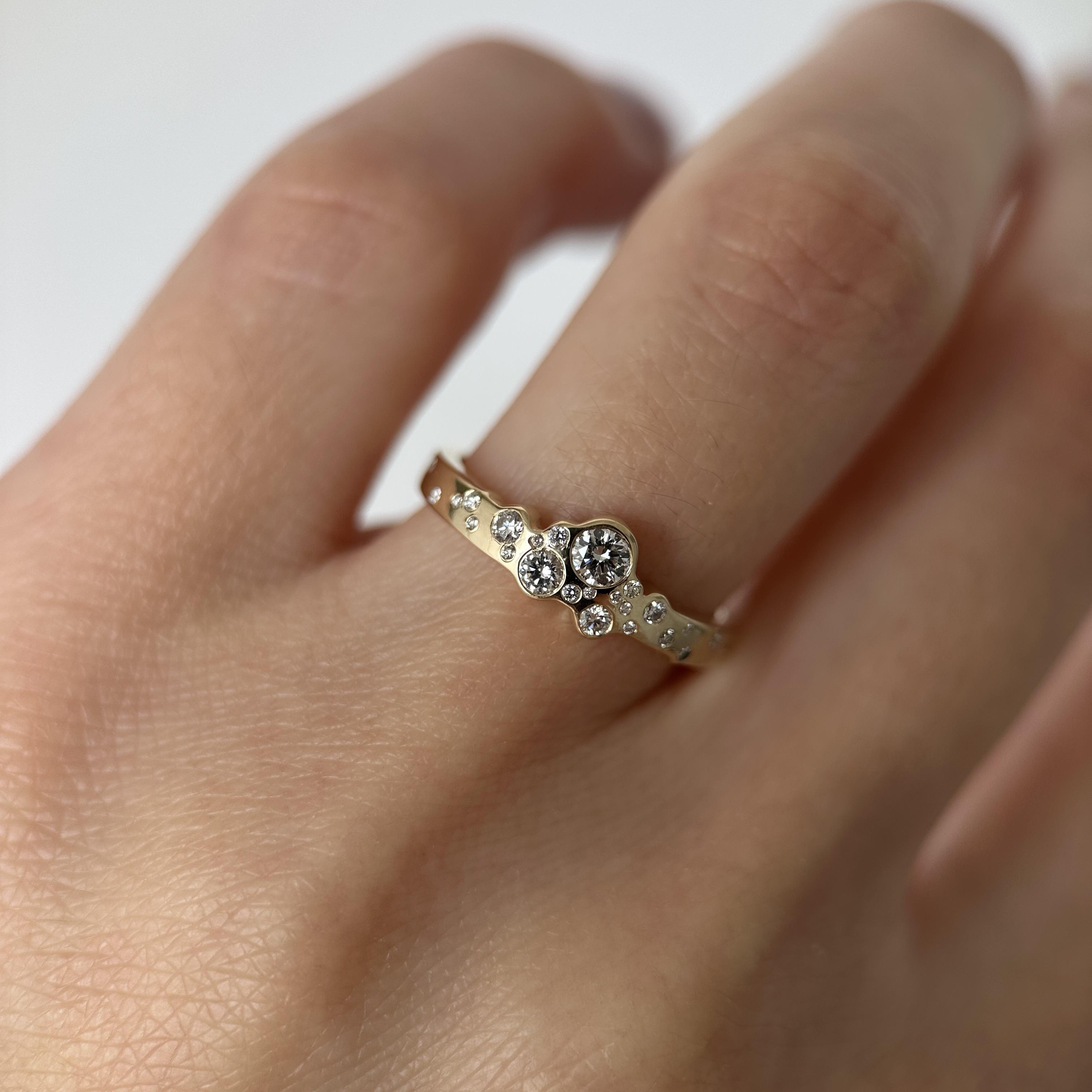 Elegant gold diamond ring featuring a celestial-inspired design with brilliant-cut diamonds in a scattered, organic pattern. Perfect as a unique wedding or stacking ring